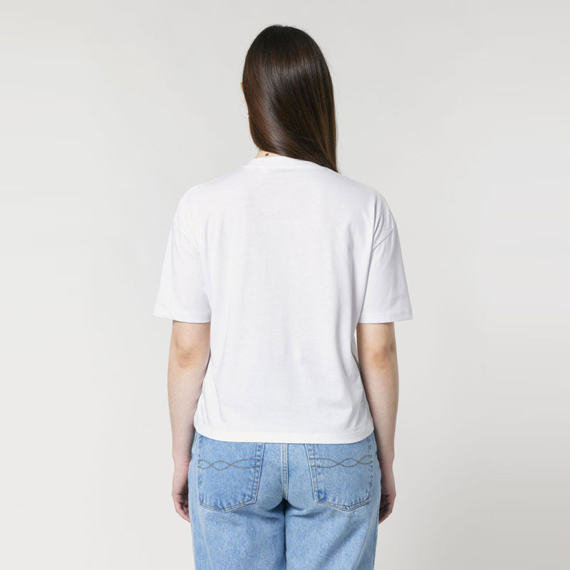 Camiseta Atlas para mujer de corte cuadrado, realizada en punto de jersey sencillo 100% de algodón orgánico hilado y peinado de 155 GSM de grosor en color blanco.
